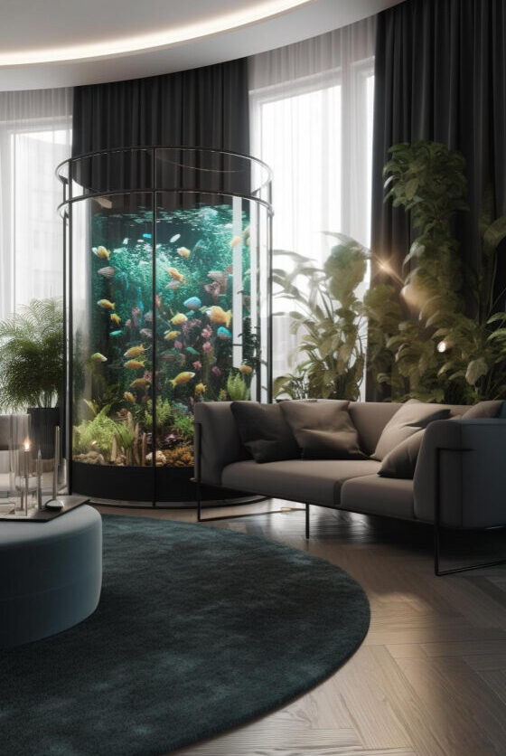 A living hall brought to life with a stunning circular aquarium as its centrepiece.