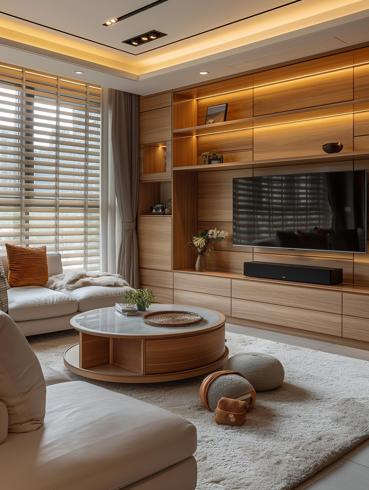 A living hall designed for comfort and style — with smart storage, a sleek TV unit, and plush seating.