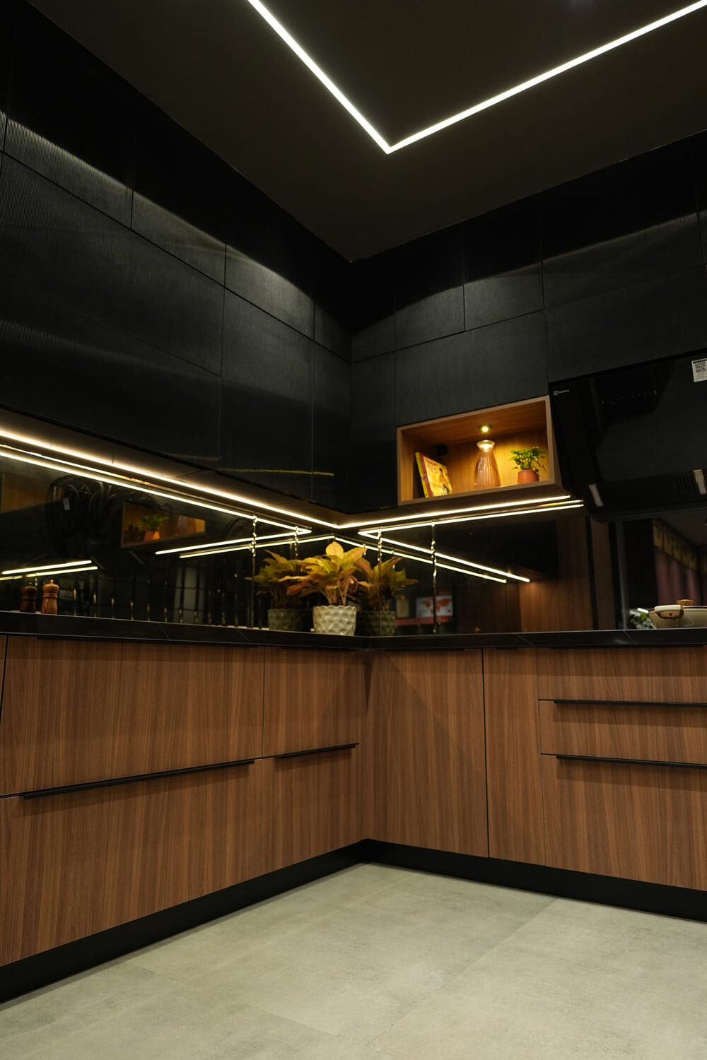 A warm wooden modular kitchen paired with the elegance of clean marble finishes.